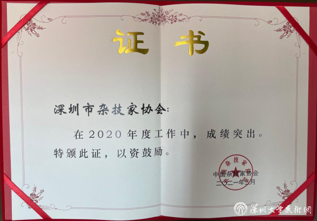 2021年3月25日至26日,中國(guó)雜技家協(xié)會(huì)第八屆理事會(huì)第二次會(huì)議在廣州成功召開(kāi)。會(huì)上,深圳市雜技家協(xié)會(huì)榮獲中國(guó)雜技家協(xié)會(huì)頒發(fā)的2020年度“成績(jī)突出”獎(jiǎng),是全國(guó)唯一受到中國(guó)雜技家協(xié)會(huì)表彰的市級(jí)協(xié)會(huì),這也是該協(xié)會(huì)第三次獲此殊榮。