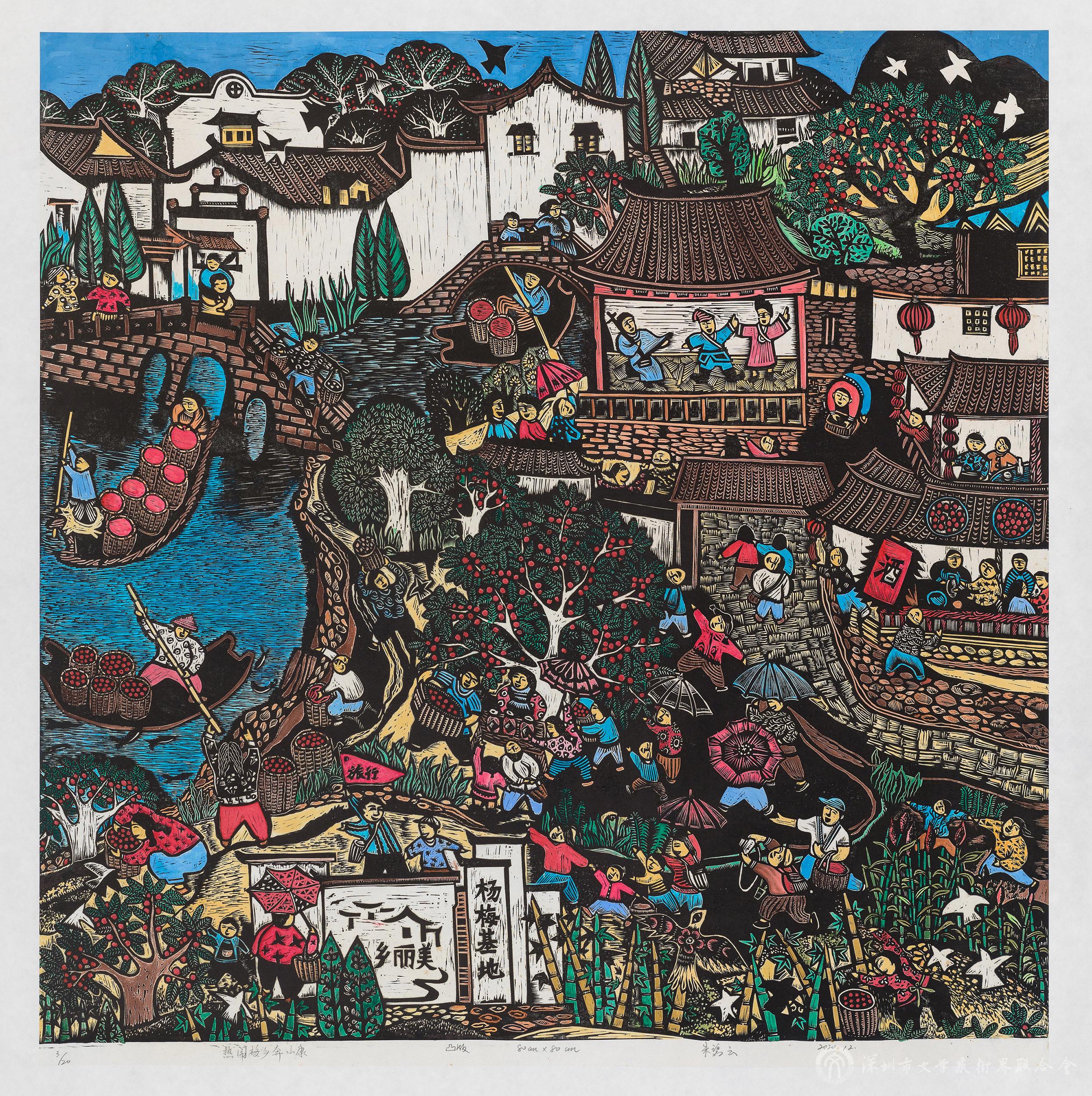 朱碧云《熱鬧梅鄉奔小康》套色木刻 2020
